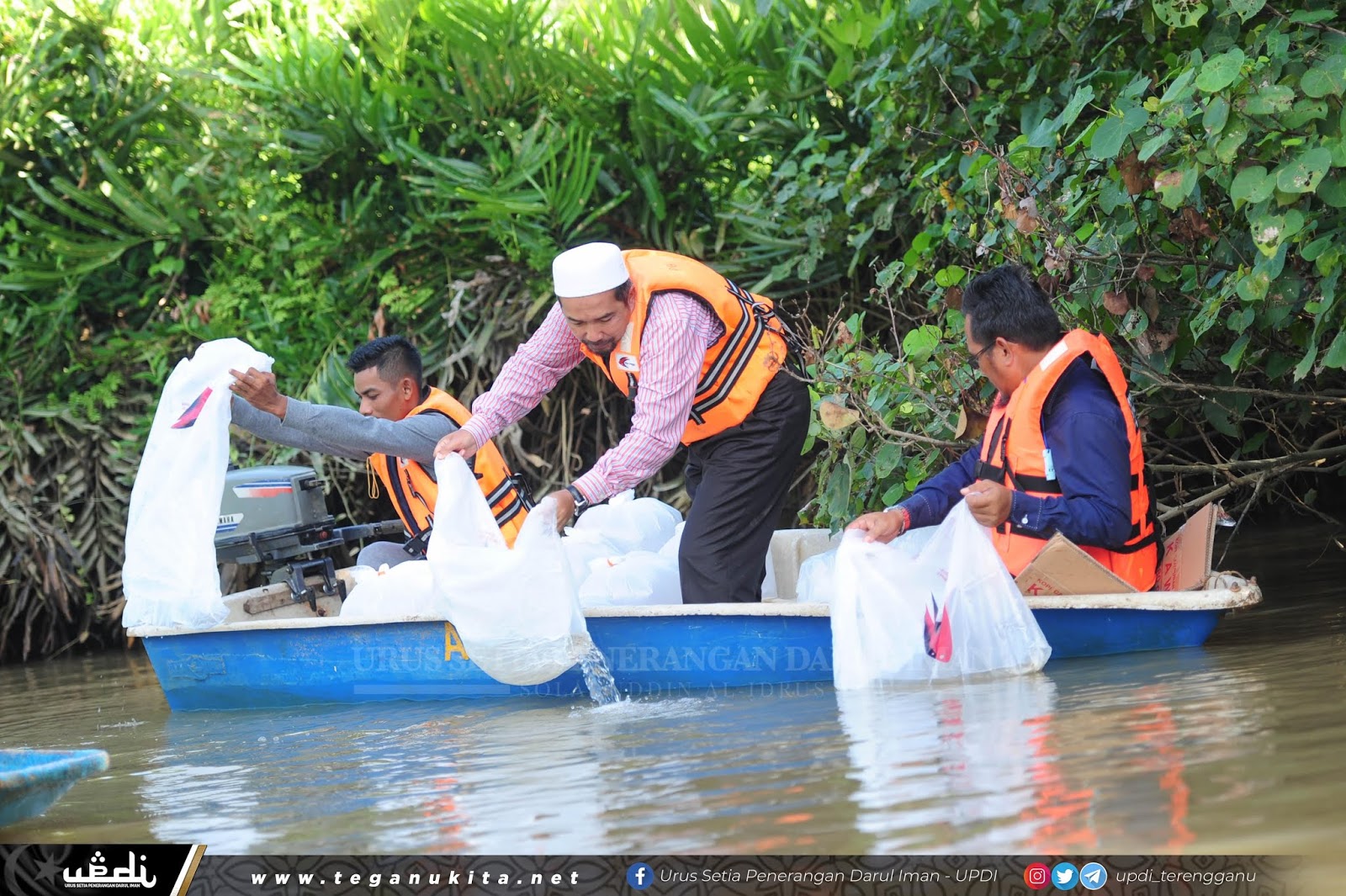 | Ustaz Sulaiman (tengah) melepaskan anak ikan Lampam Sungai. |