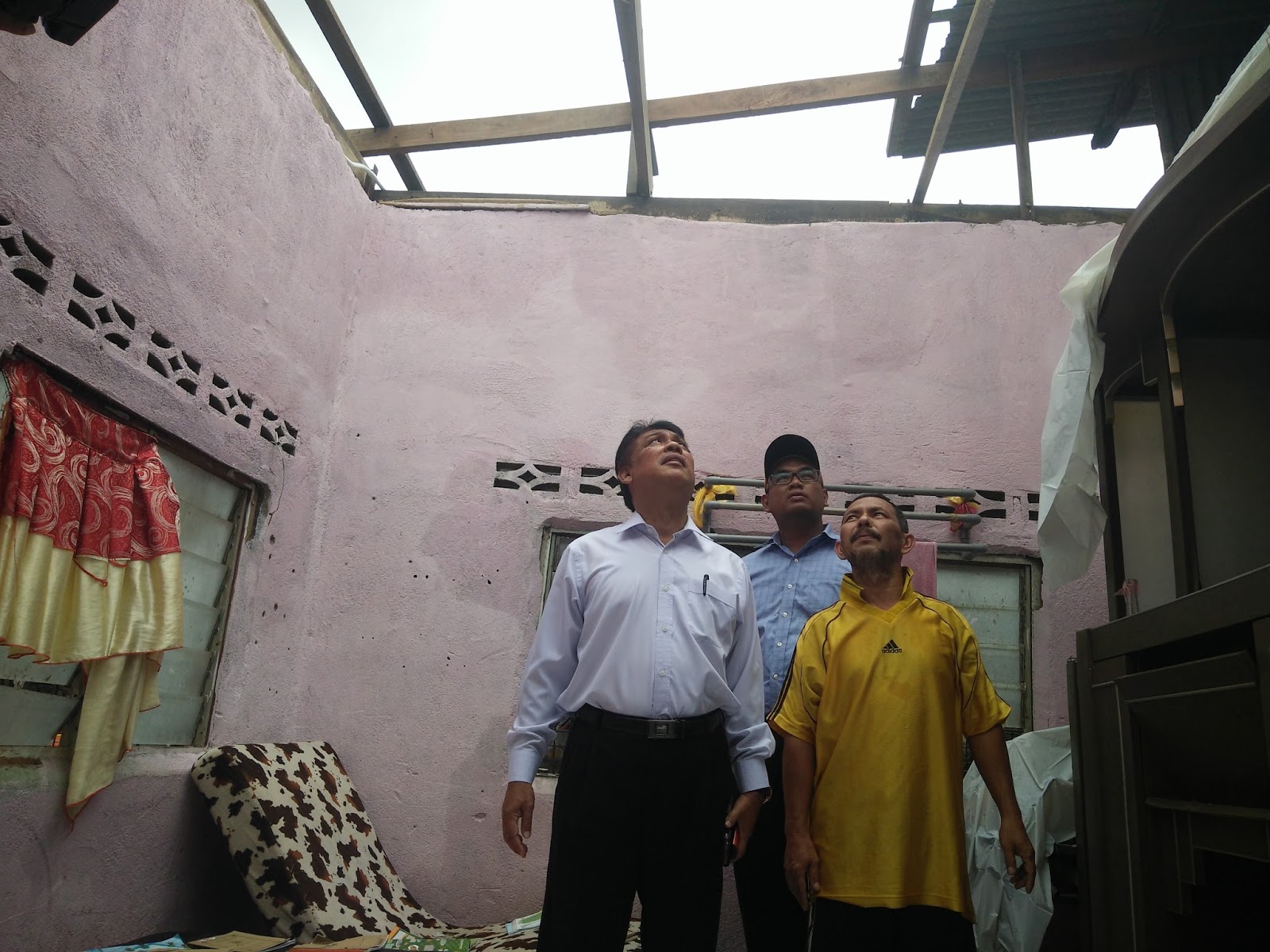| Ghazali melihat keadaan rumah Mohd Shafei(Berbaju Kuning)yang di landa ribut.Turut hadir Pegawai JKM Hulu Terengganu,Norazmy Adenan(Tengah) |