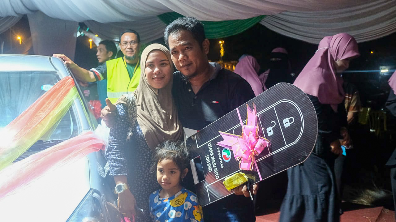 DUNGUN, 29 Mei - Kehadirannya hanyalah sekadar menunai ajakan isteri, tetapi tidak menyangka permintaan isteri itu akhirnya membawa tuah setelah berjaya memenangi sebuah kereta Perodua Axia 1.0G (AT).