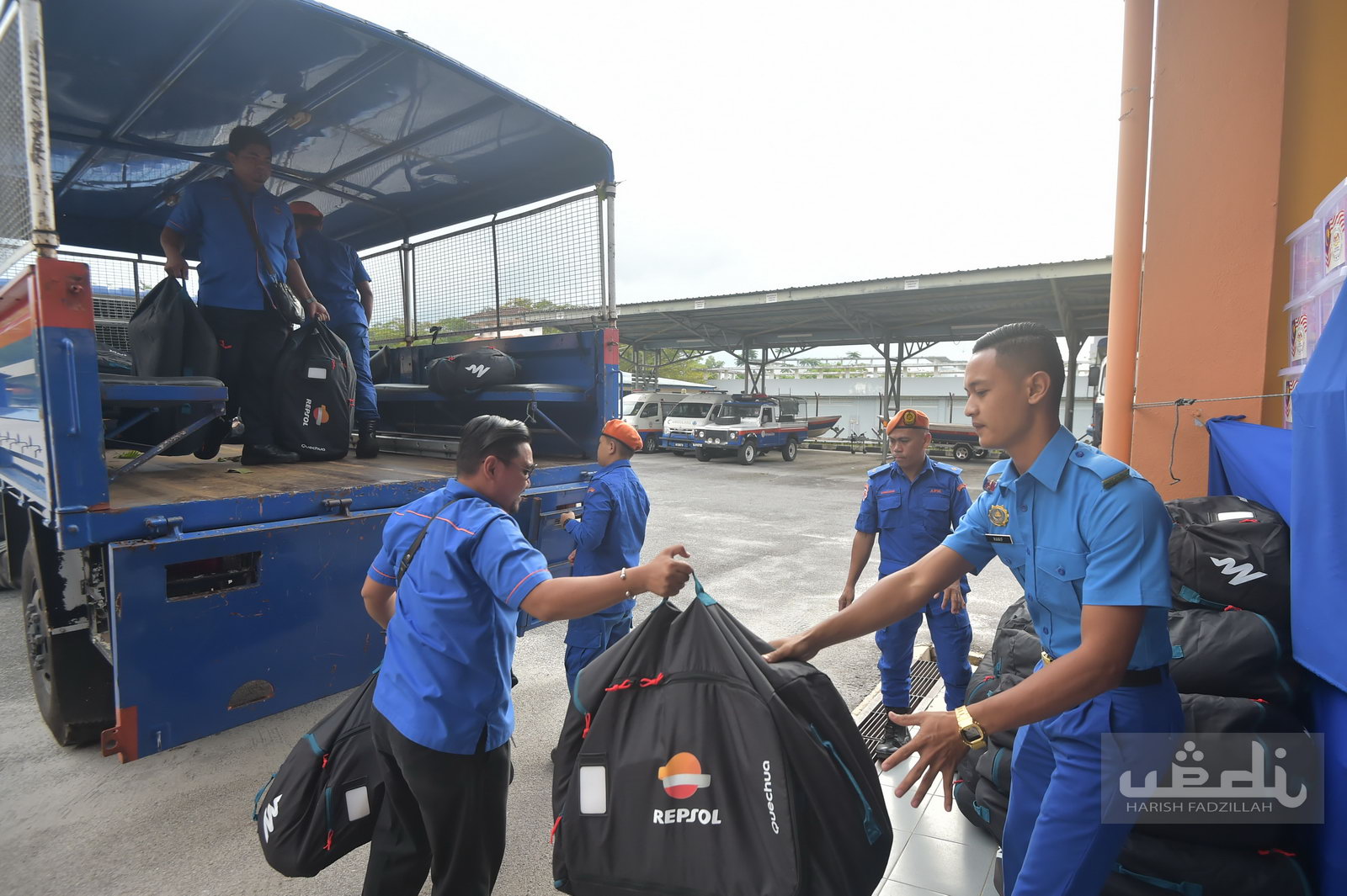 | 'Banjir kit' dipunggah keluar dari lori APM Terengganu sebelum diagih kepada penerima bantuan. |