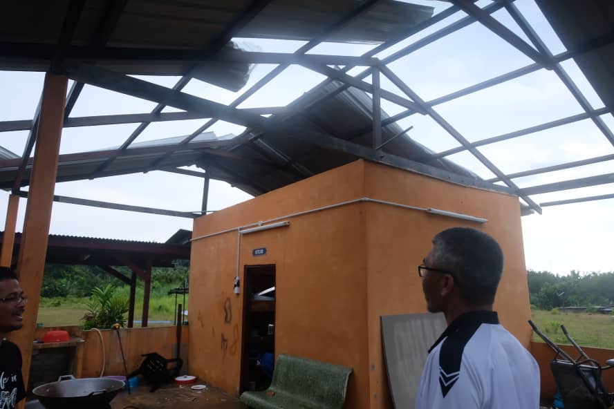 Dalam kejadian kira-kira jam 4.30 petang semalam, "kepala angin" menyebabkan atap zink stor masjid dan beberapa buah rumah tercabut.