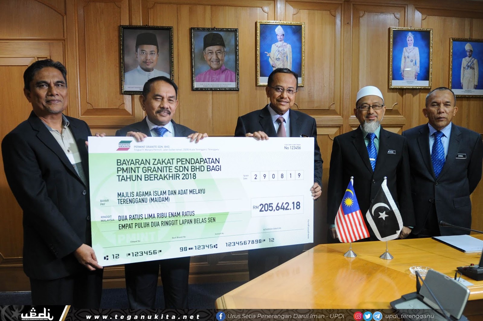 Penyerahan replika cek zakat tersebut disempurnakan oleh Pengerusi Permint Granite, Che Ghani Che Ambak dan Ahli Lembaga Pengarah Pmint Urus merangkap Ketua Pegawai Operasi PMINT, Wan Adnan Wan Derahman.