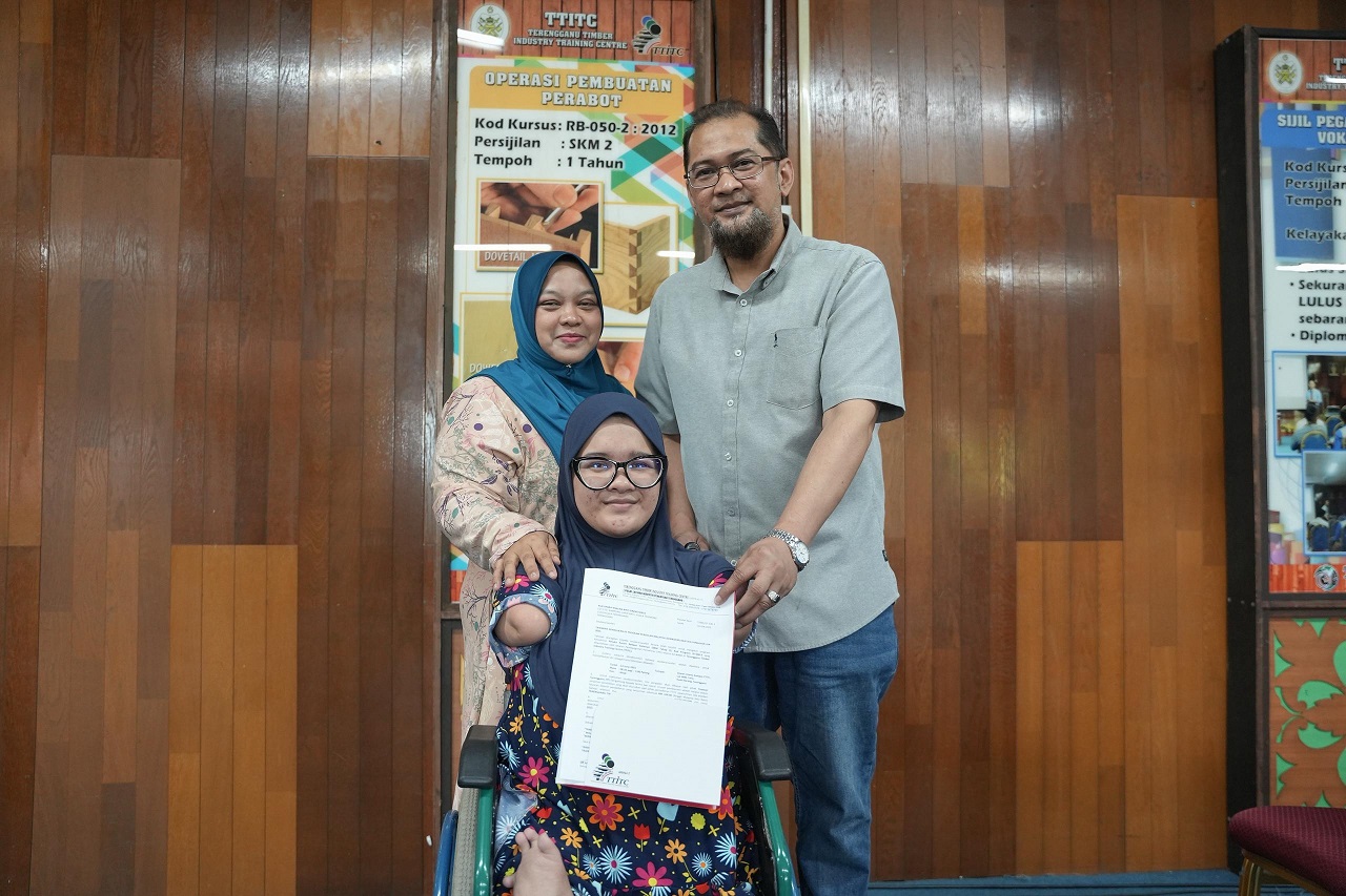 Nur Damia Irsalina Daeng Malis, 18, yang dilahirkan tanpa anggota tangan dan kaki yang sempurna, membuktikan bahawa semangat dan ketekunan mampu membuka peluang besar apabila berjaya melanjutkan pengajian ke Sijil Kemahiran Malaysia (SKM) Tahap 3 dalam jurusan Pelukis Kanan Rekaan Dalaman di Pusat Latihan Industri Perkayuan Terengganu (TTITC), Kampung Teris.