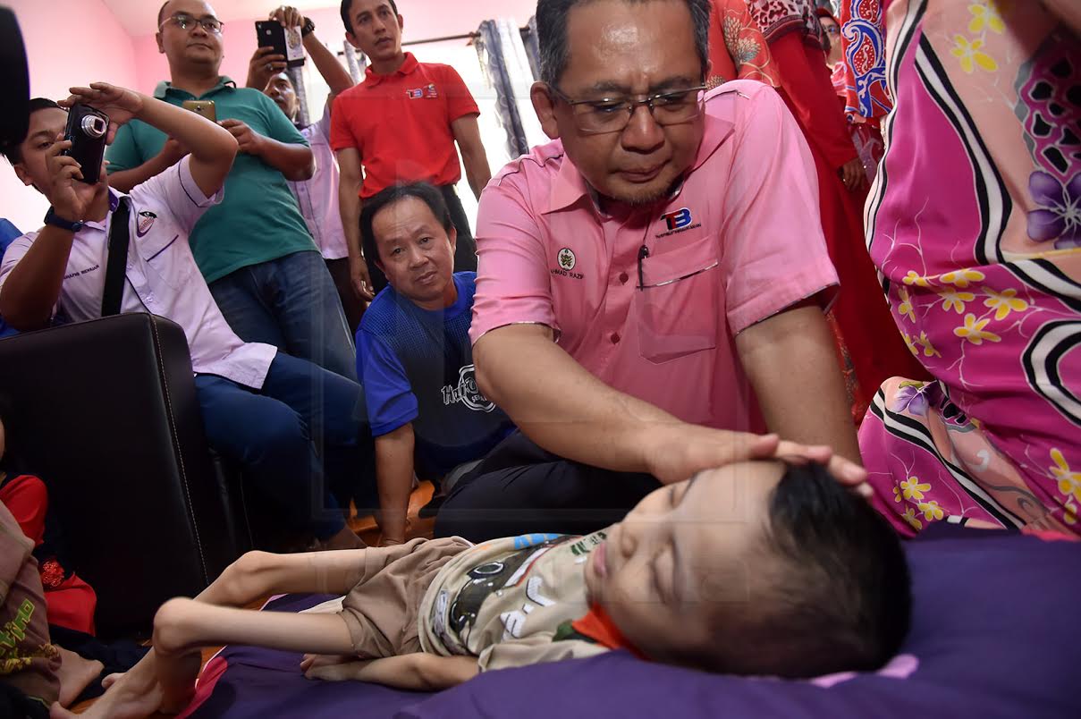 | Ahmad Razif bertanya khabar adik Nur Sofeatul Aiesha Zamani yang menghidap 'Alobar Holoprosencephaly' pada Program Turun Padang di Dewan Undangan Negeri Ajil, hari ini. Foto Oleh: Tg Syamim Tg Ismail |