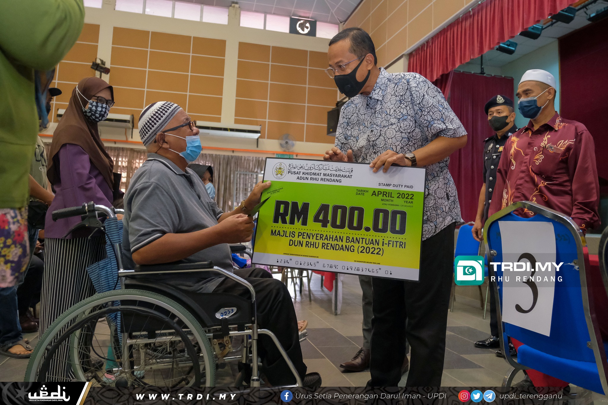 "Saya juga ingin merakamkan penghargaan kepada petugas Pusat Khidmat Masyarakat, Pejabat Daerah Marang, Institut Modal Insan Terengganu Sejahtera (i-MiTS) DUN Rhu Rendang dan Jawatankuasa Pembangunan dan Keselamatan Kampung (JPKK) yang telah membanting tulang dan bersengkang mata bagi menguruskan permohonan sebelum ini.