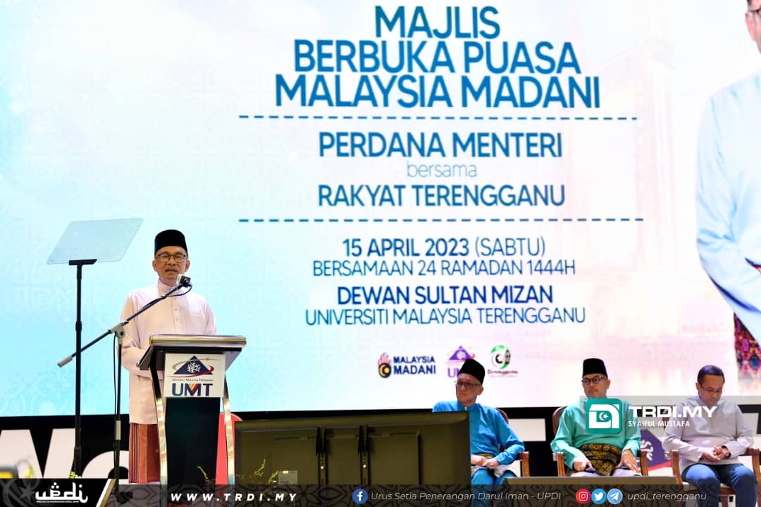 KUALA NERUS, 16 April - Menteri Besar, Dato’ Seri Dr Ahmad Samsuri Mokhtar mengiringi Perdana Menteri, Datuk Seri Anwar Ibrahim berbuka puasa bersama rakyat Terengganu di Dewan Sultan Mizan, Universiti Malaysia Terengganu (UMT) semalam.