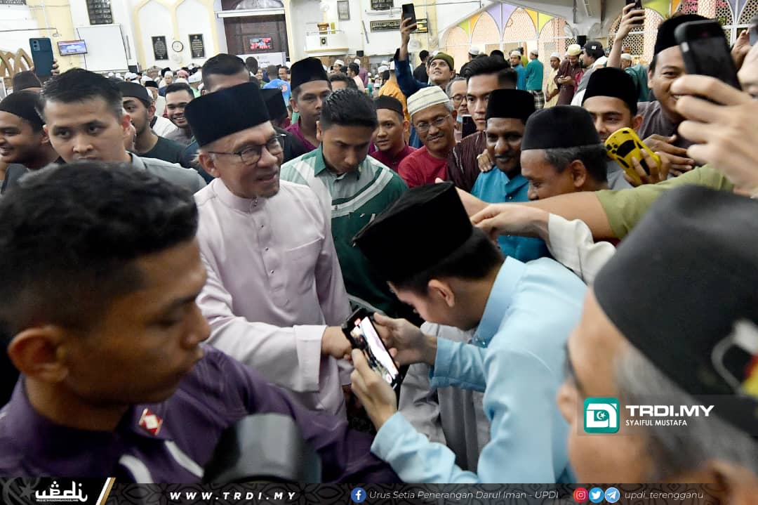 Anwar turut meluangkan masa beramah mesra dengan para pelajar, warga UMT dan masyarakat setempat yang hadir sebelum menunaikan solat Maghrib secara berjemaah di Masjid Pusat Islam Sultan Mahmud, UMT.