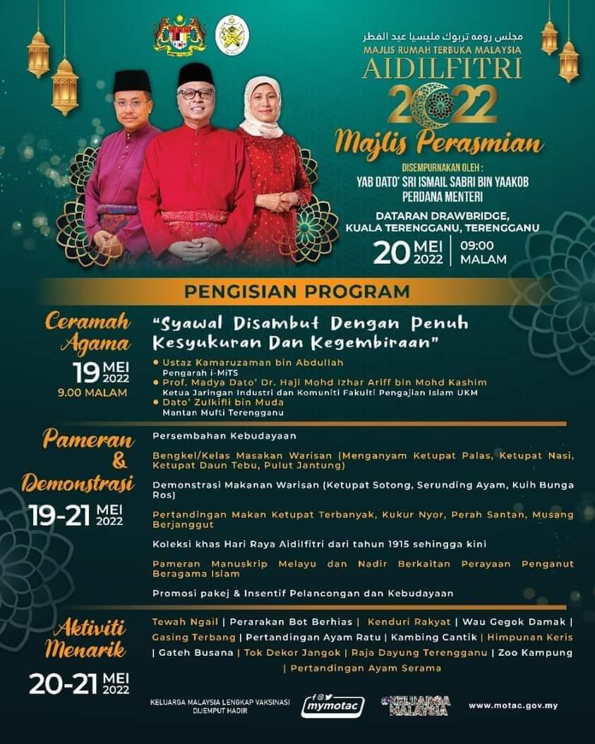 KUALA TERENGGANU, 17 Mei- Kementerian Pelancongan, Seni dan Budaya (MOTAC) memilih negeri Terengganu bagi Majlis Rumah Terbuka Malaysia (MRTM) Aidilfitri 2022 dengan kerjasama Kerajaan negeri setelah mengambil kira populasi penduduk yang dominan meraikan sambutannya selama ini.