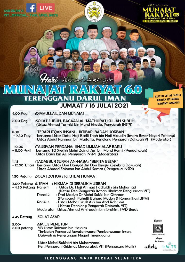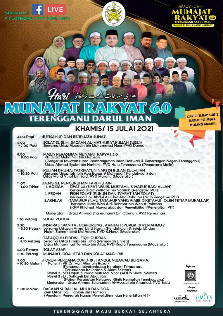 KUALA TERENGGANU, 15 Julai - Seluruh umat Islam dalam negeri Terengganu khususnya diajak untuk sama-sama menghidup dan menghayati program Munajat Rakyat 6.0 sebagai ikhtiar mengharungi musibah pandemik COVID-19.