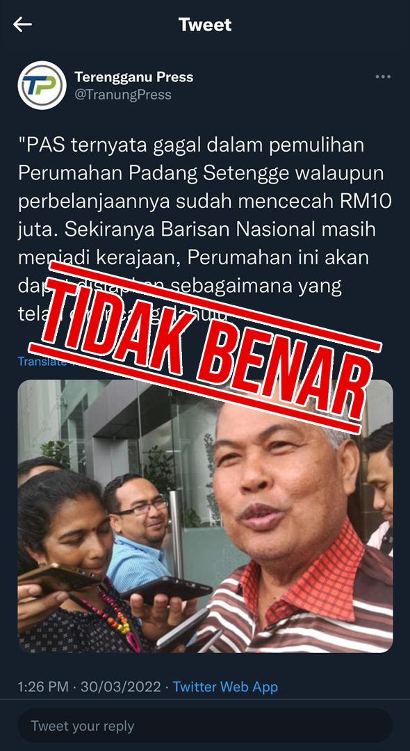 “Projek perumahan tersebut sepatutnya siap pada Ogos 2014 ketika Dato' Seri Ahmad Said menjadi Menteri Besar namun terbengkalai sehingga PAS mengambil alih kerajaan dan berjaya menyelesaikan isu tersebut.