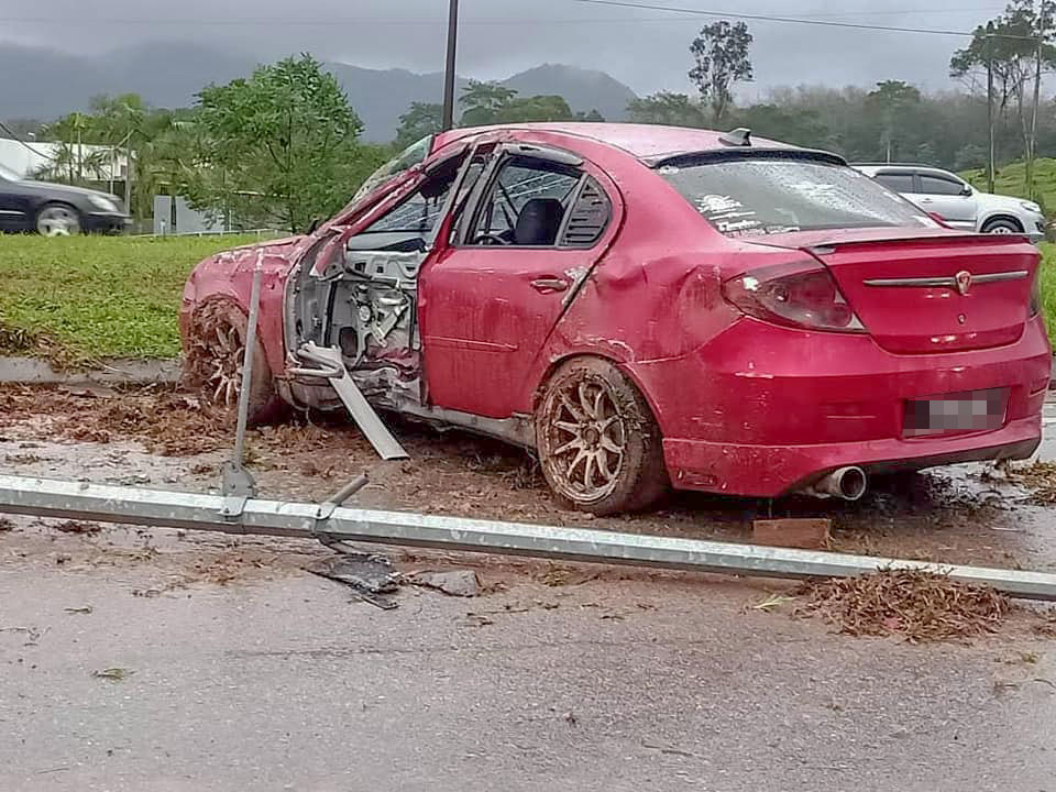 Katanya, keretanya melanggar lopak air menyebabkan hilang kawalan sehingga terbabas ke tengah jalan sebelum melanggar sebatang tiang lampu elektrik.