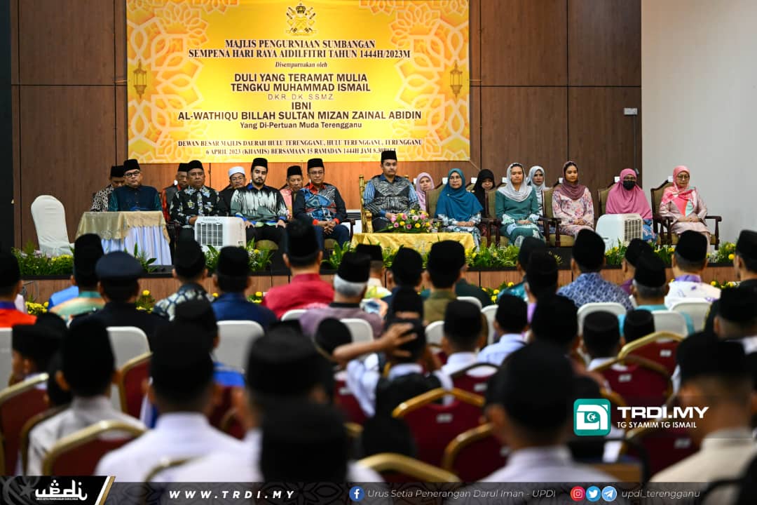 HULU TERENGGANU, 6 April - Yang di-Pertuan Muda Terengganu, Tengku Muhammad Ismail Sultan Mizan Zainal Abidin berkenan mencemar duli mengurniakan Sumbangan Sempena Hari Raya Aidilfitri kepada 300 orang pelajar terpilih di daerah ini.