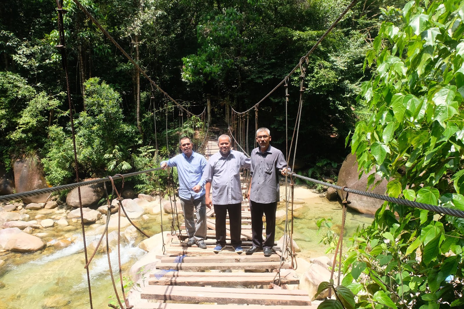 | Ariffin (tengah) berdiri di atas jambatan gantung uzur yang menjadi laluan ke gunung Sarut dari Lata Payung. |