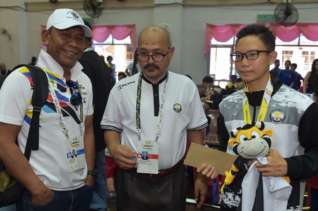 | Ibni (tengah) bersama penyumbang pingat pertama Terengganu bagi acara wushu Mohamad Afiq Danial Firdaus Chua, di temasya SUKMA 2018, hari ini. Foto Harish Fadzillah Abu Kassim |