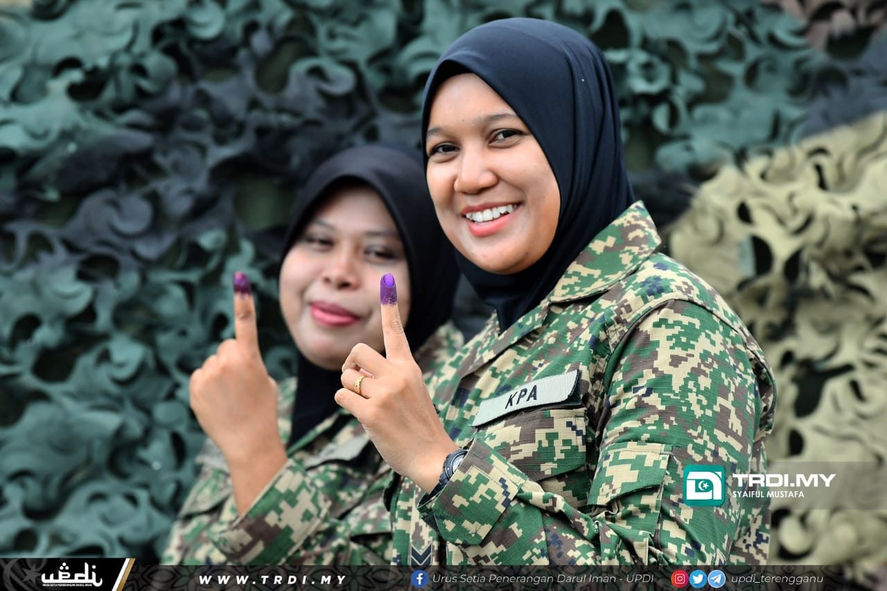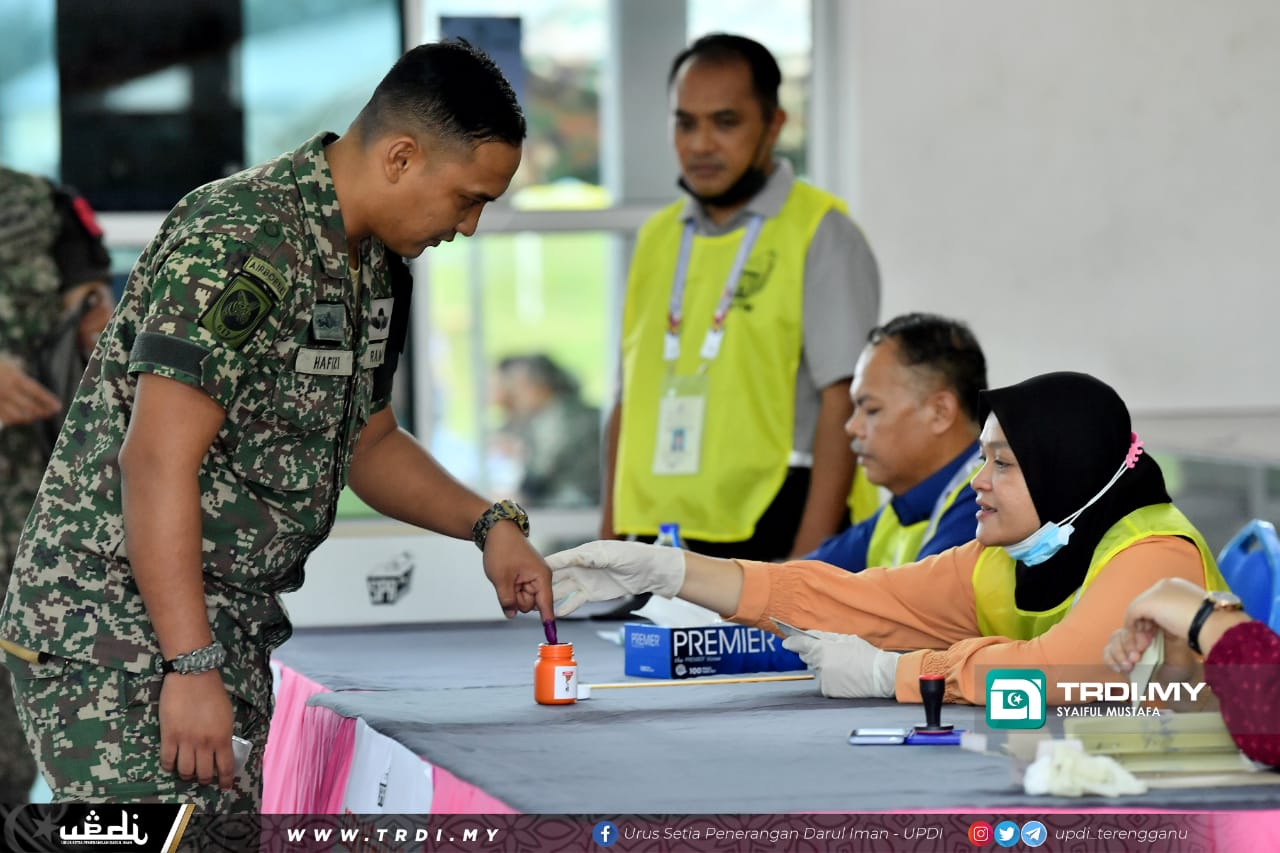 KUALA NERUS, 15 November - Seramai 692 daripada 833 anggota tentera Rejimen Askar Melayu Diraja (RAMD) dan pasangan di Kem Seri Pantai 18 RAMD, di sini hadir menunaikan tanggungjawab mengundi, pagi ini.