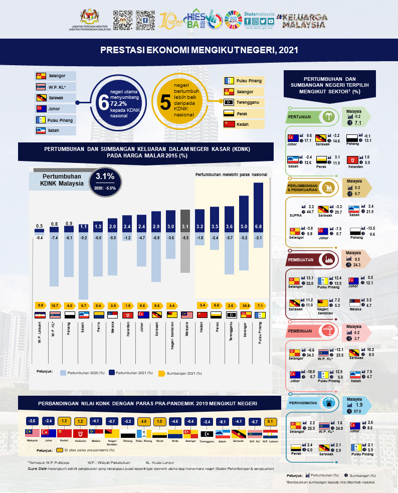 Menurut perangkaan terkini dikeluarkan Jabatan Perangkaan Malaysia (DOSM), ekonomi lima negeri yang berprestasi lebih baik itu adalah Pulau Pinang, yang mengungguli prestasi KDNK 2021 dengan mencatatkan pertumbuhan 6.8 peratus, diikuti oleh Selangor dengan (5.0 peratus), Terengganu (3.6 peratus), Perak (3.5 peratus) dan Kedah (3.2 peratus).
