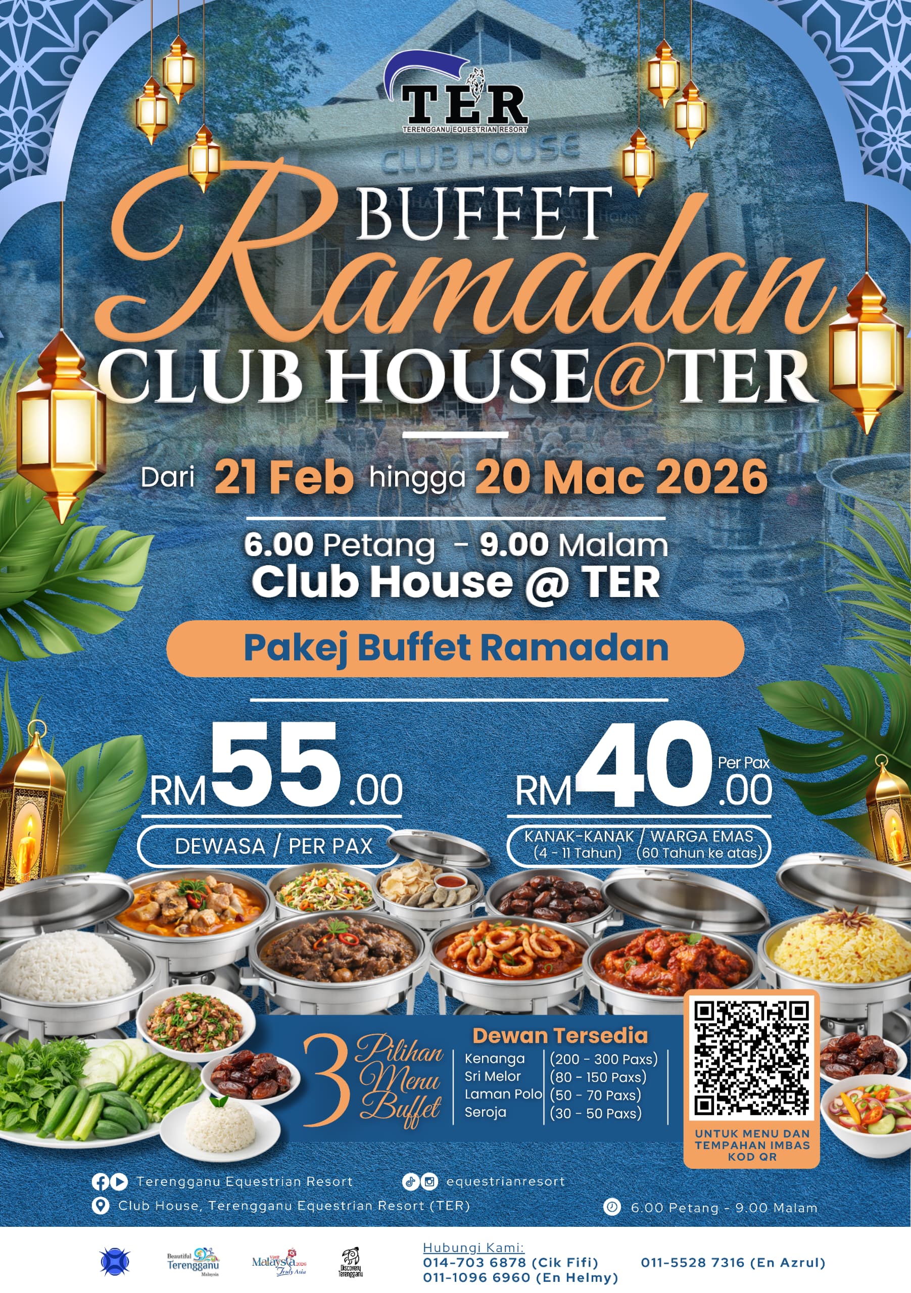 "Bufet Ramadan TER ditawarkan pada harga RM55 seorang bagi dewasa dan RM40 bagi warga emas serta kanak-kanak berusia empat hingga 12 tahun, dengan tiga pilihan menu serta tempahan minimum 40 orang yang berlangsung dari 21 Februari hingga 18 Mac 2026.
