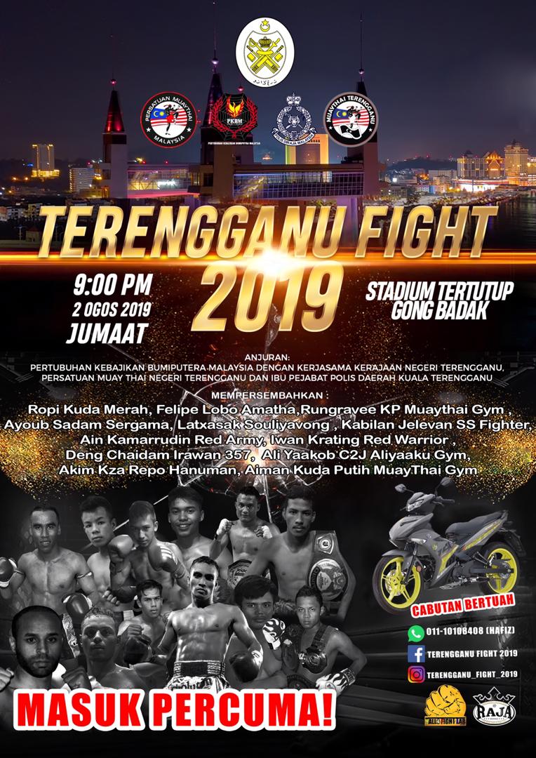 KUALA TERENGGANU, 29 Julai - Kurang lima hari lagi, peminat sukan lasak Muay Thai berpeluang menyaksikan pertembungan 12 petarung dalam dan luar negara di Kejohanan Terengganu Fight 2019 yang bakal berlangsung di Stadium Tertutup, Kompleks Sukan Gong Badak, 2 Ogos ini.